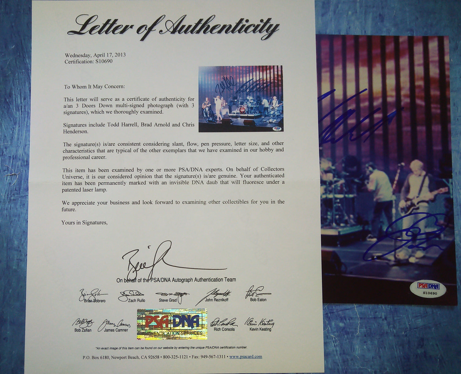 3 Doors Down Hand Signed Autograph 8x10 Photo PSA COA Brad Arnold