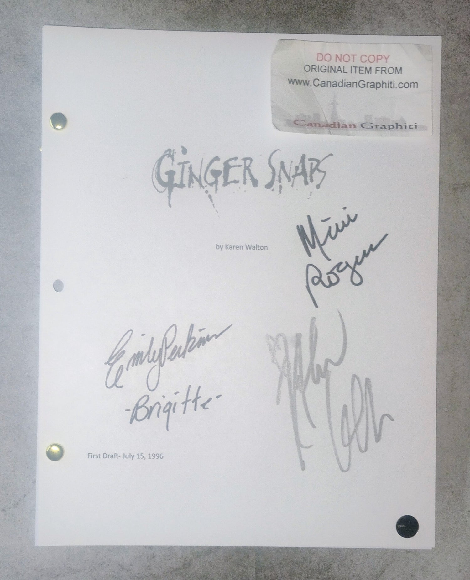 Ginger Snaps complete first draft script hand signed by Katherine Isabelle, Emily Perkins & Mimi Rogers