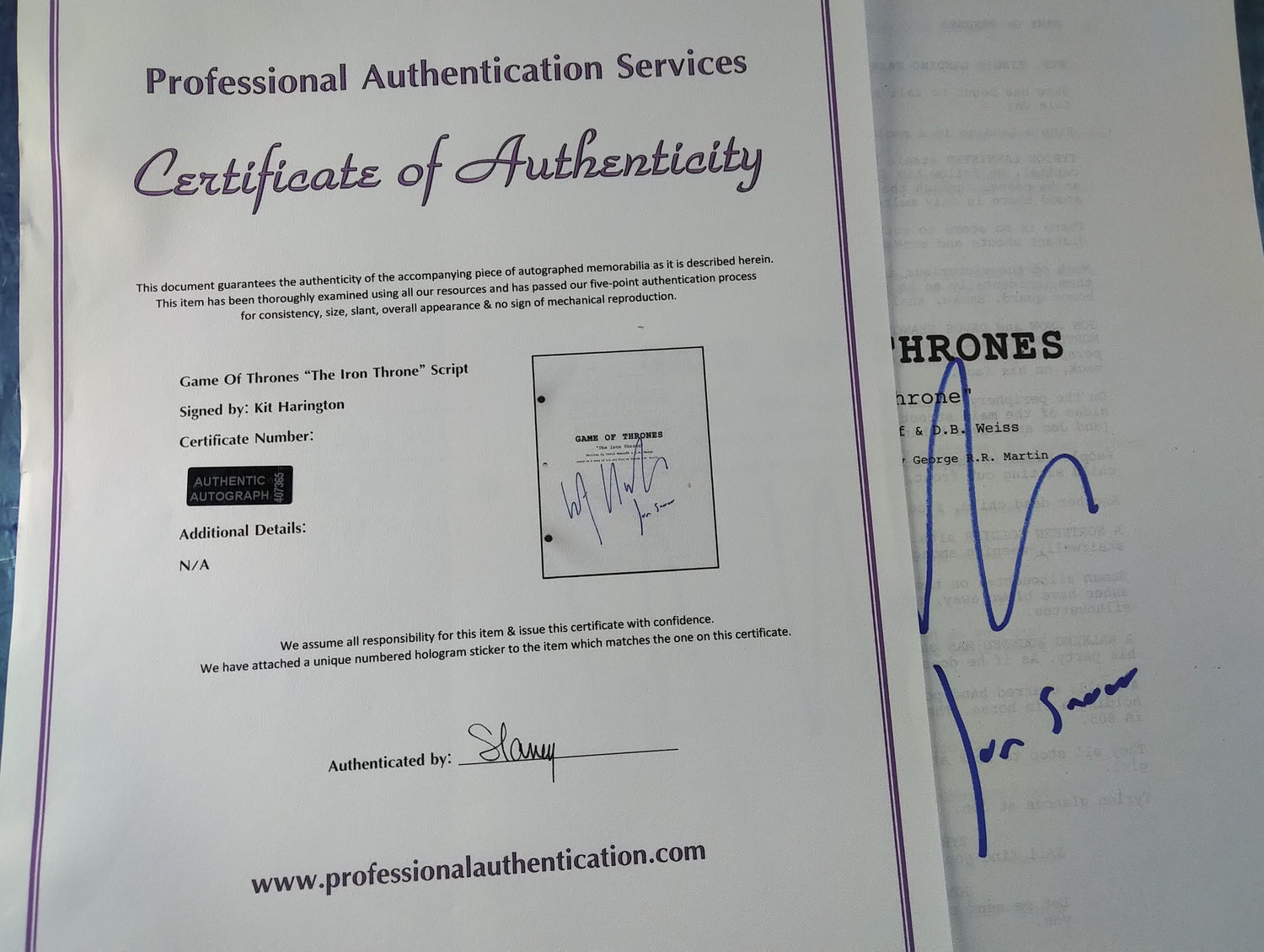 Kit Harington Hand Signed Autograph Game Of Thrones Script COA