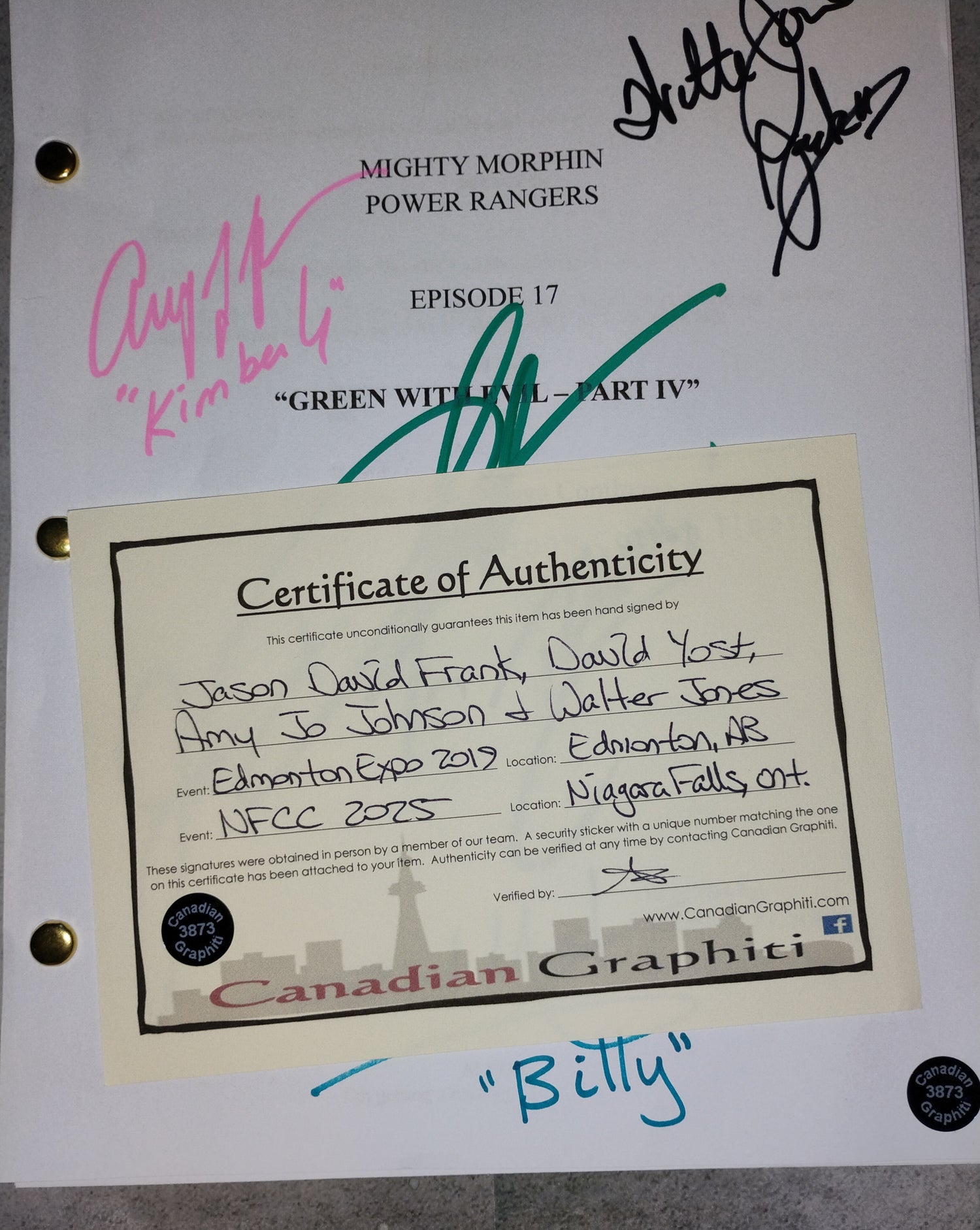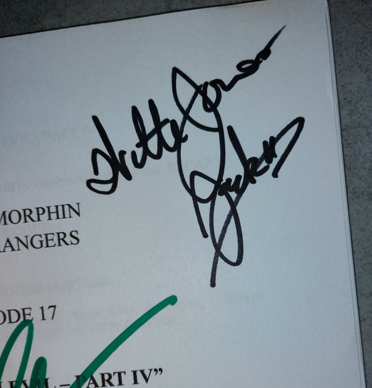 Mighty Morphing Power Rangers complete post production script signed by Walter Jones, Amy Jo Johnson, Jason David Frank & Amy Jo Johnson