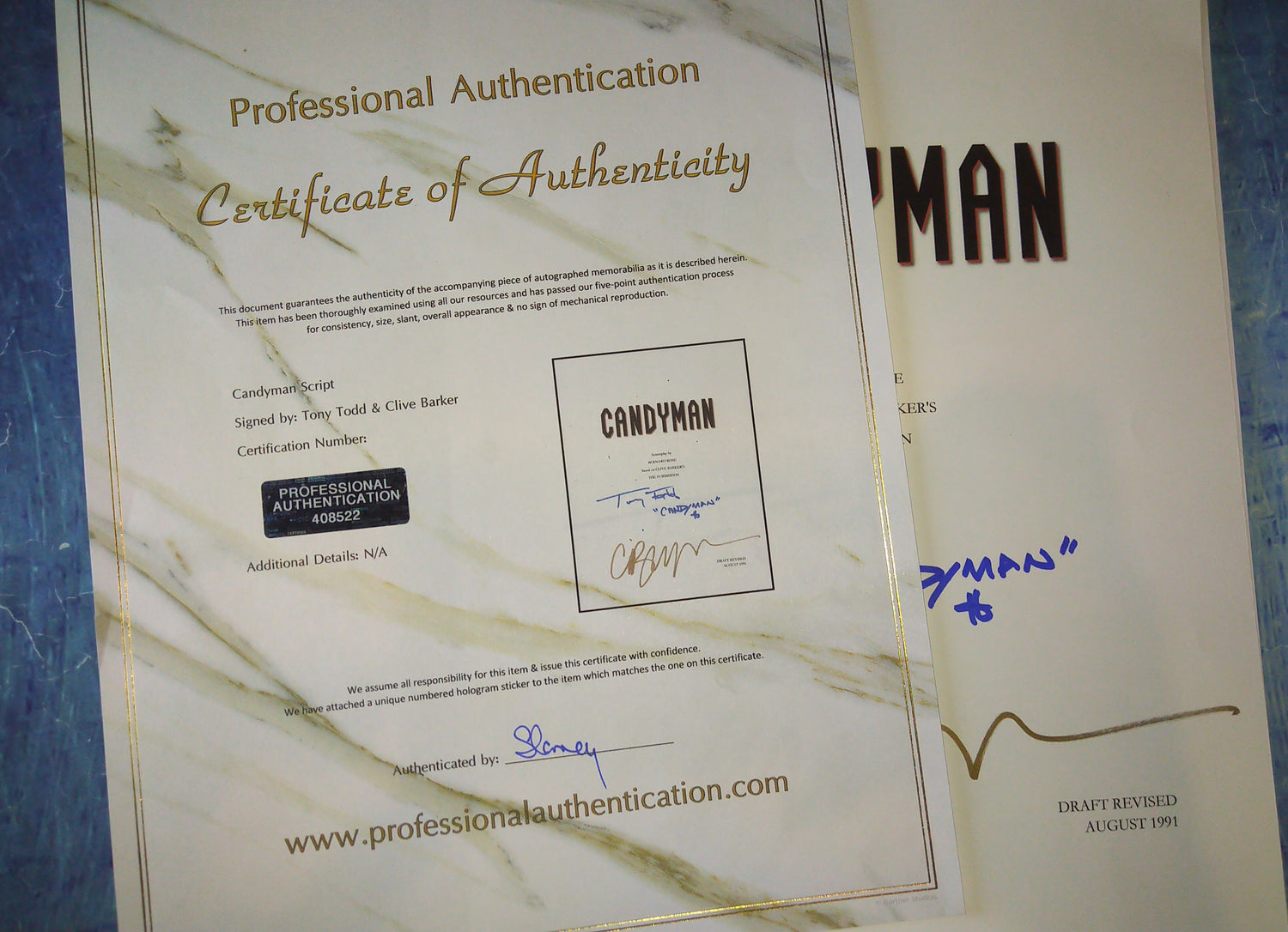 Tony Todd & Clive Barker Hand Signed Autograph Candyman Script COA